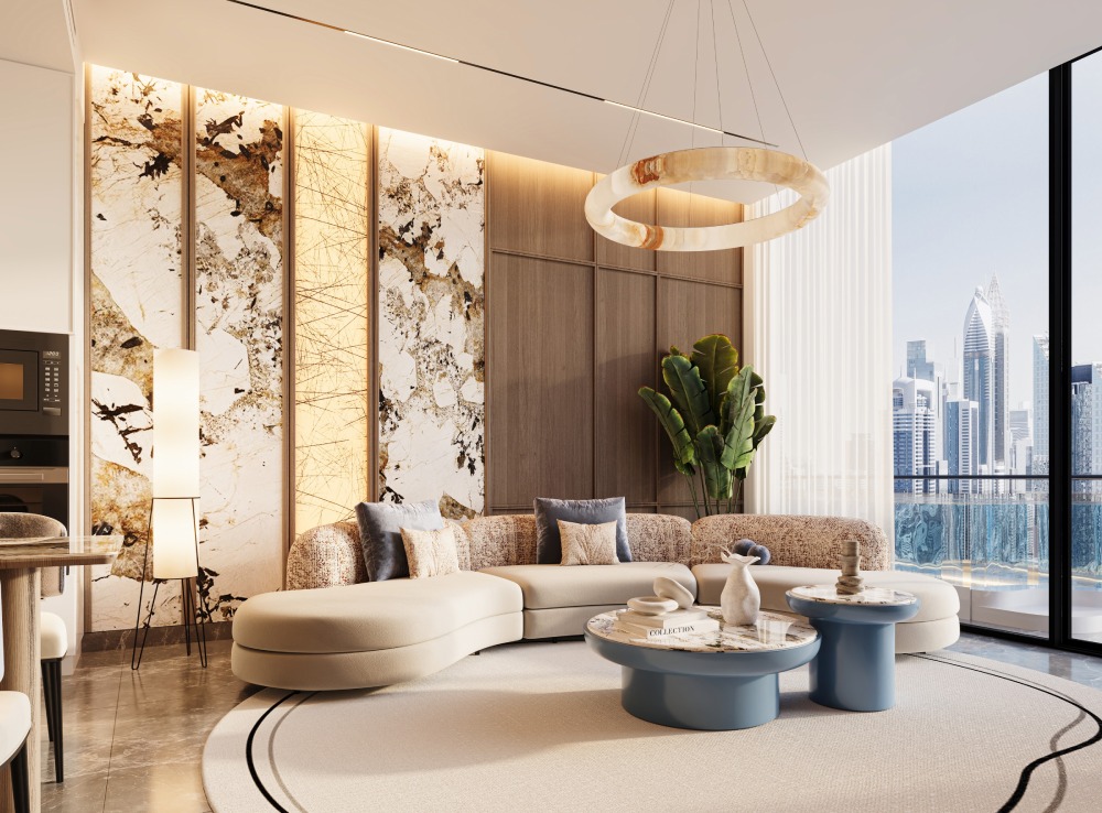 Layref is a luxury to the resilience, adaptability, Spacious modern villa living room with centrally placed swimming pool blending indooroutdoor.